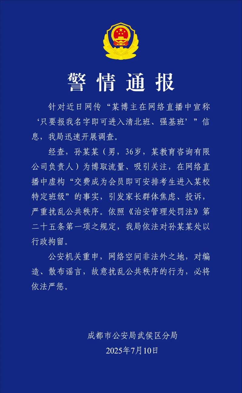 股票4倍杠杆 某博主直播宣称“报我名字可进清北班” 成都警方:行政拘留